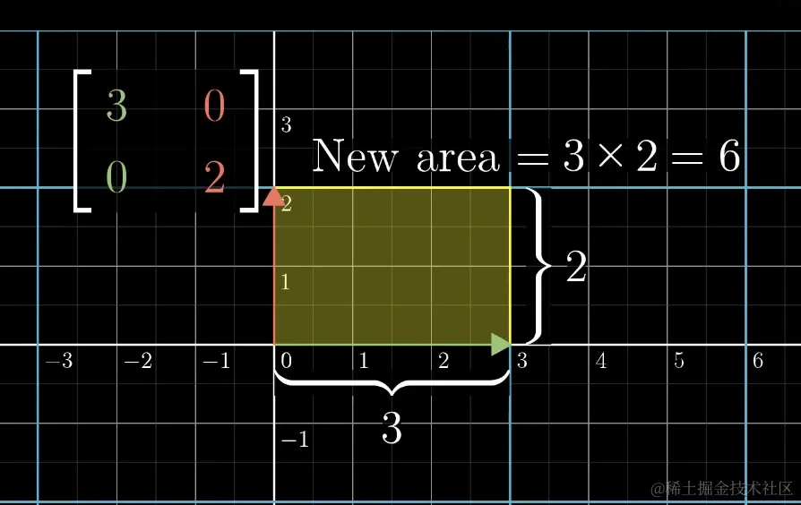 比如下面这样的线性变换矩阵,将原来面积为 1 的区域变成了长度为 3 宽度为 2 的矩阵,所有原来区域的面积都变味了最初的 6 倍。