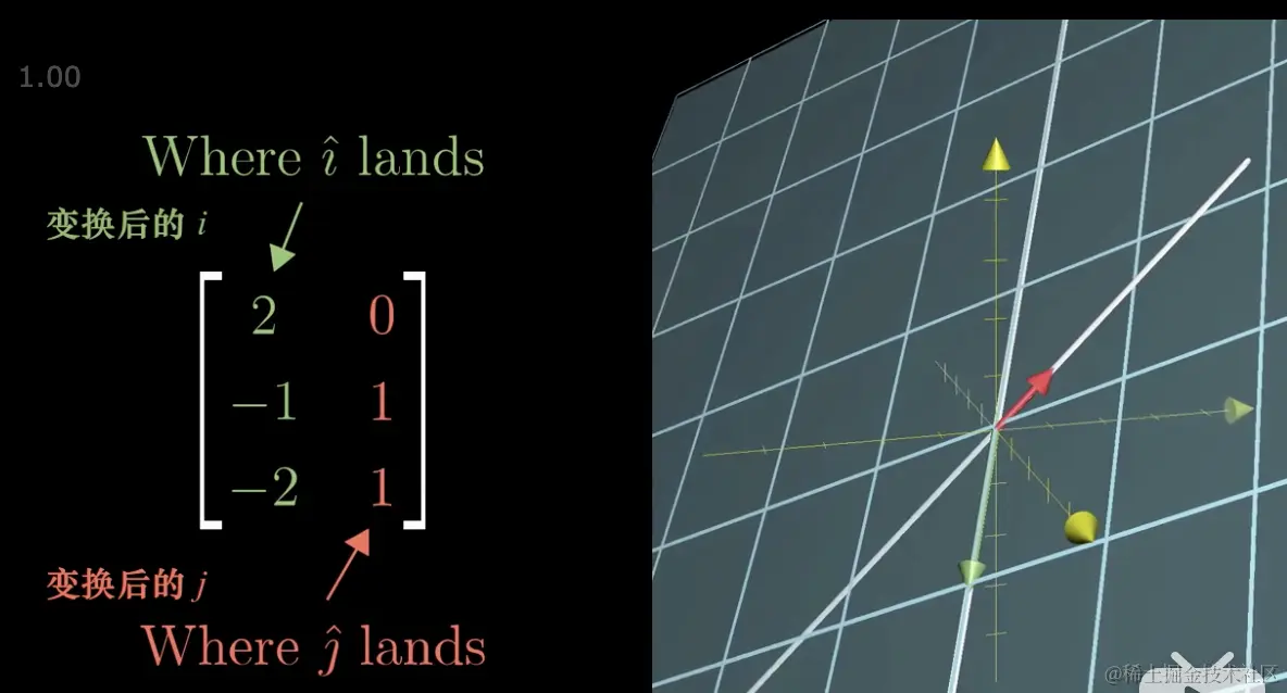 也就是把二维空间映射到三维空间中,每个基向量在变换后都有对应的基向量。