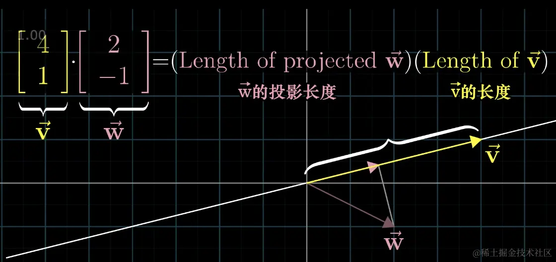 这是通常意义上的点积,下面我们将来理解集合上的意义,就是将一个向量投影到另外一个向量的方向上,然后乘以另外一个向量的长度,就得到了点积。