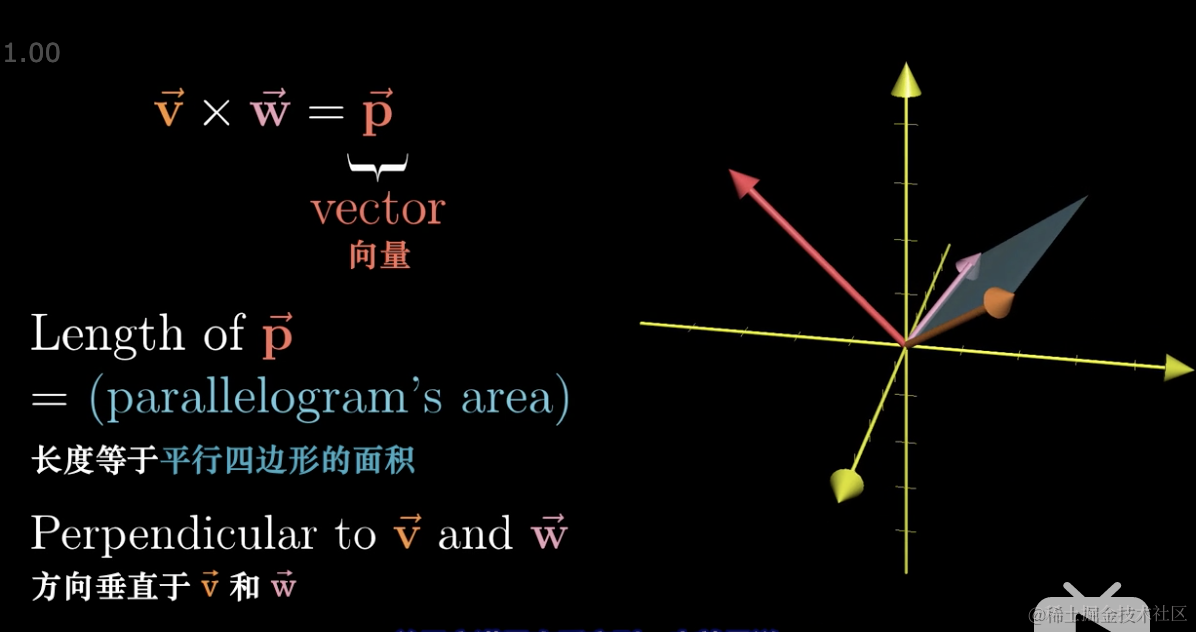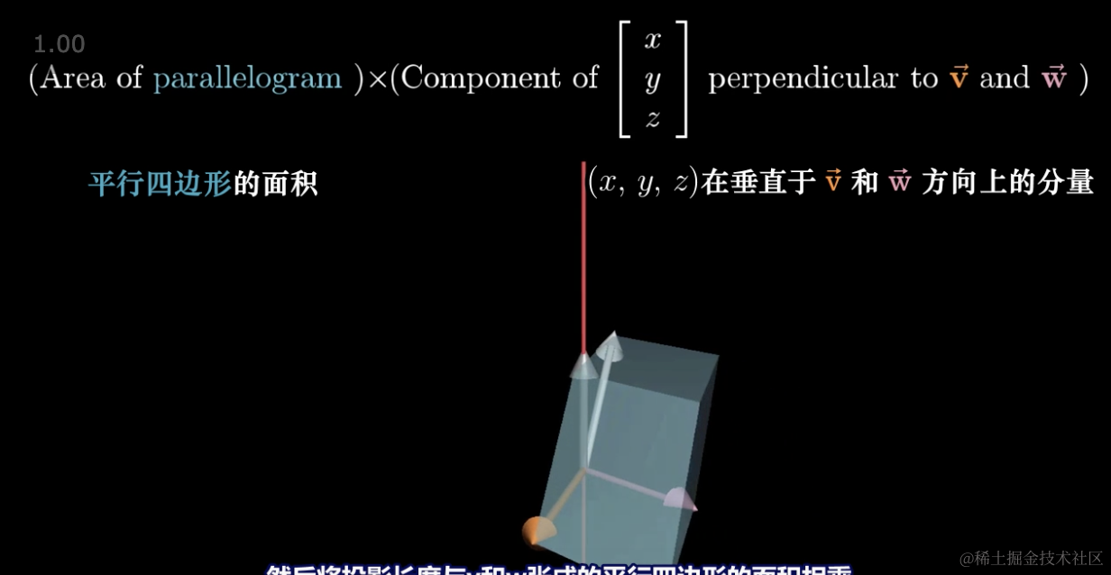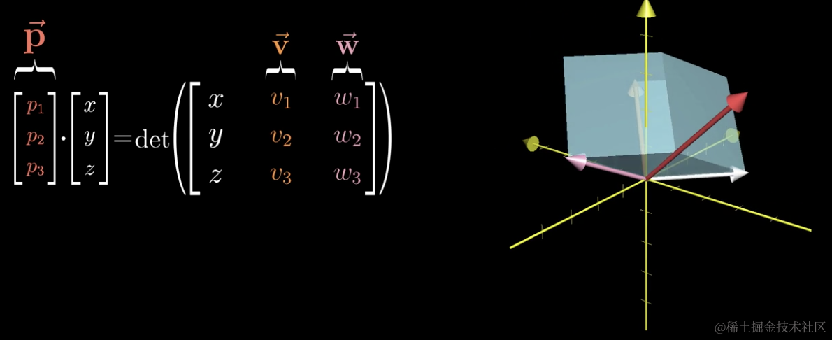 我们以 v,w为底的平行四边形乘以向量 p 在垂直于平面的投影得到的体积,必然等于垂直于 v 和 w 且长度为平行四边形面积的向量与(x,y,z)点乘是同一回事。