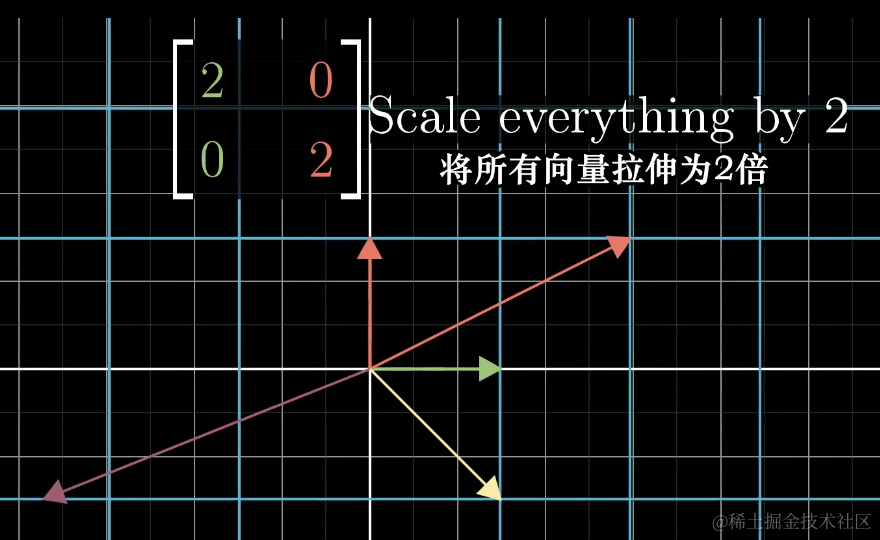 如果一个向量留在它们张成的空间里,例如下面的 两个向量,就是它们的特征向量,而被拉伸或者压缩的倍数就是特征值。