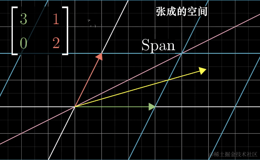 我们先来看一个线性变换的矩阵,并且考虑他所张成的空间,也就是过原点和向量尖端的直线: