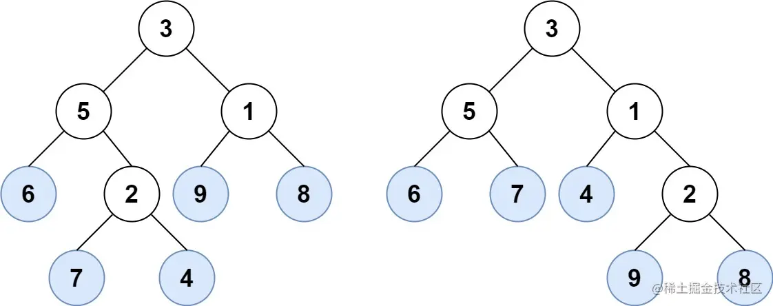 举个例子,如上图所示,给定一棵叶值序列为 (6, 7, 4, 9, 8) 的树。