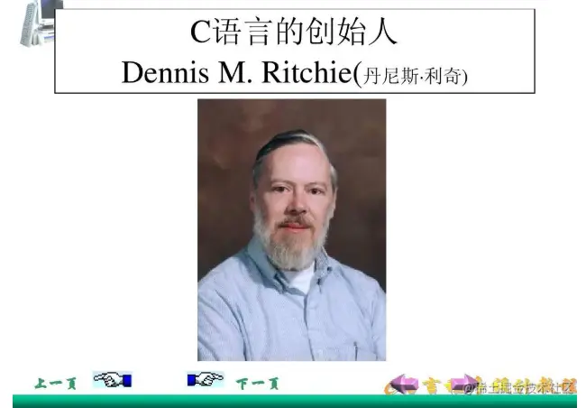 丹尼斯·里奇(Dennis M Ritchie)是C语言的创造者、Unix 操作系统的关键开发者,对计算机领域产生了深远影响,并与肯·汤普逊同为1983年图灵奖得主。此外,他还与布莱恩·柯林汉共同撰写了《C程序设计语言》——这本书所树立的标准叫做“K&R C”,其中“K”指柯林汉,而“R”指的就是里奇。