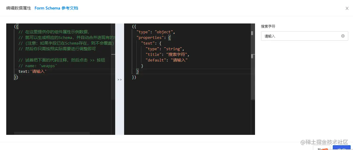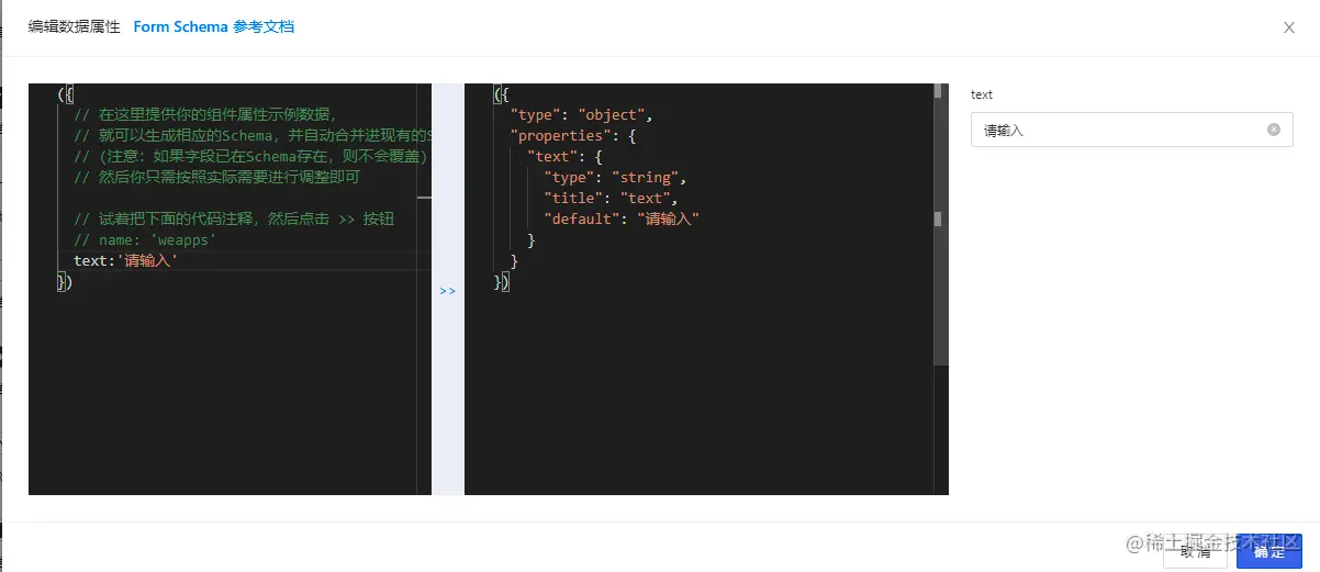 先设置组件可以绑定哪些数据,点击编辑数据属性按钮,我们接收一个文本信息,字段名称定义为text,给一个默认值,然后点击>>按钮,编辑器会自动生成代码:
