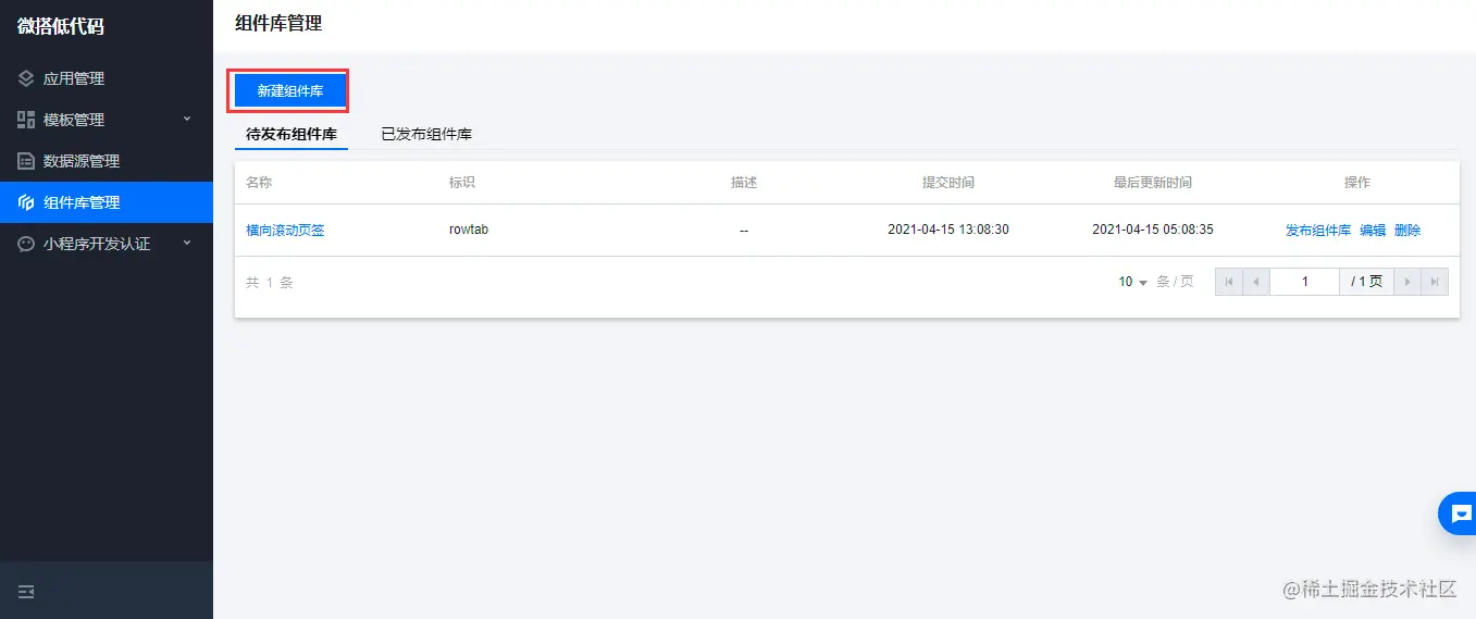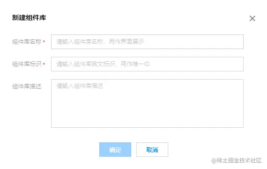 登录低码控制台,找到组件库管理菜单,点击【新建组件库】按钮,输入组件库的名称和标识。