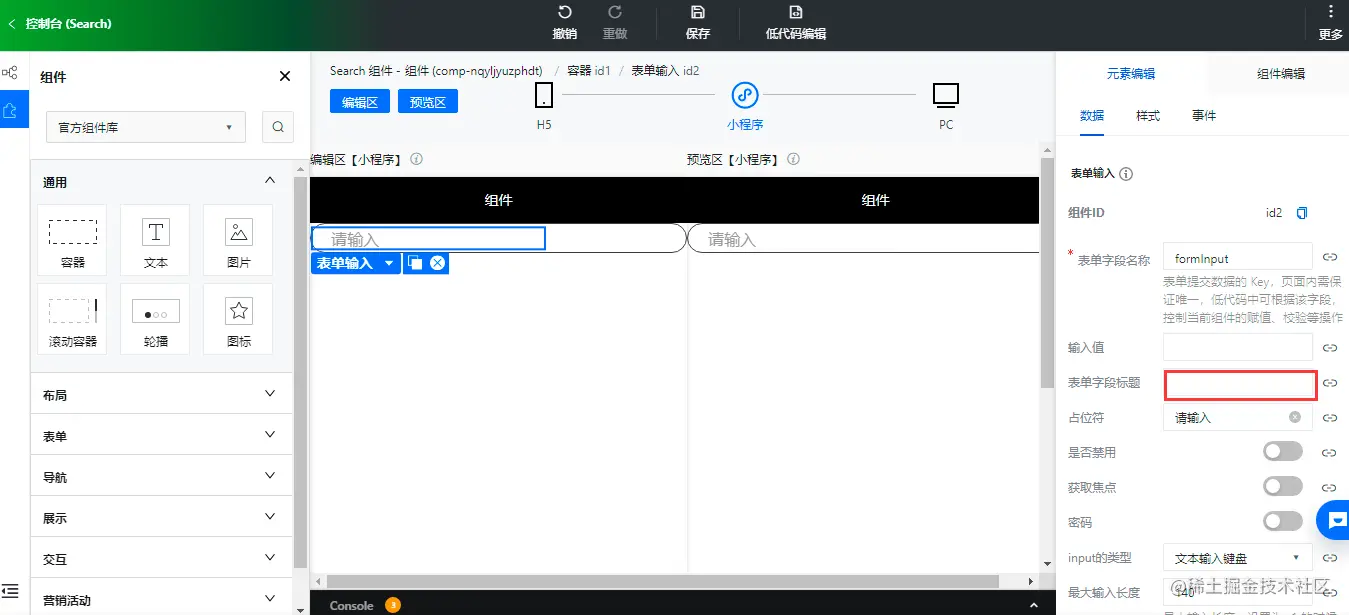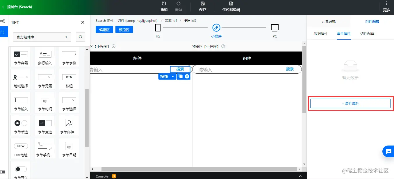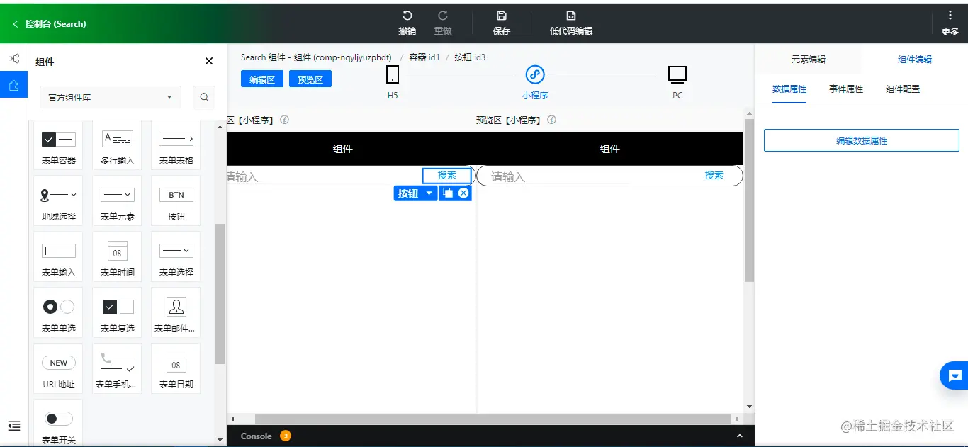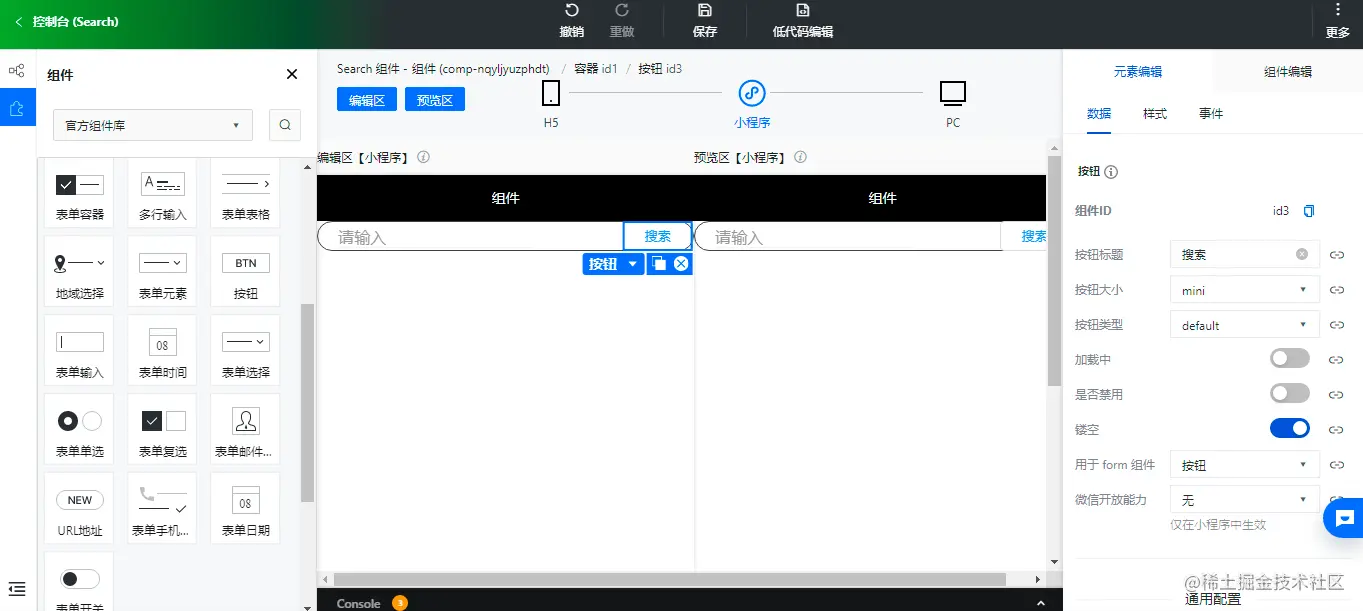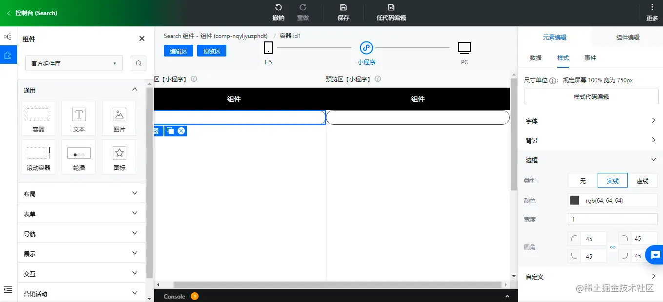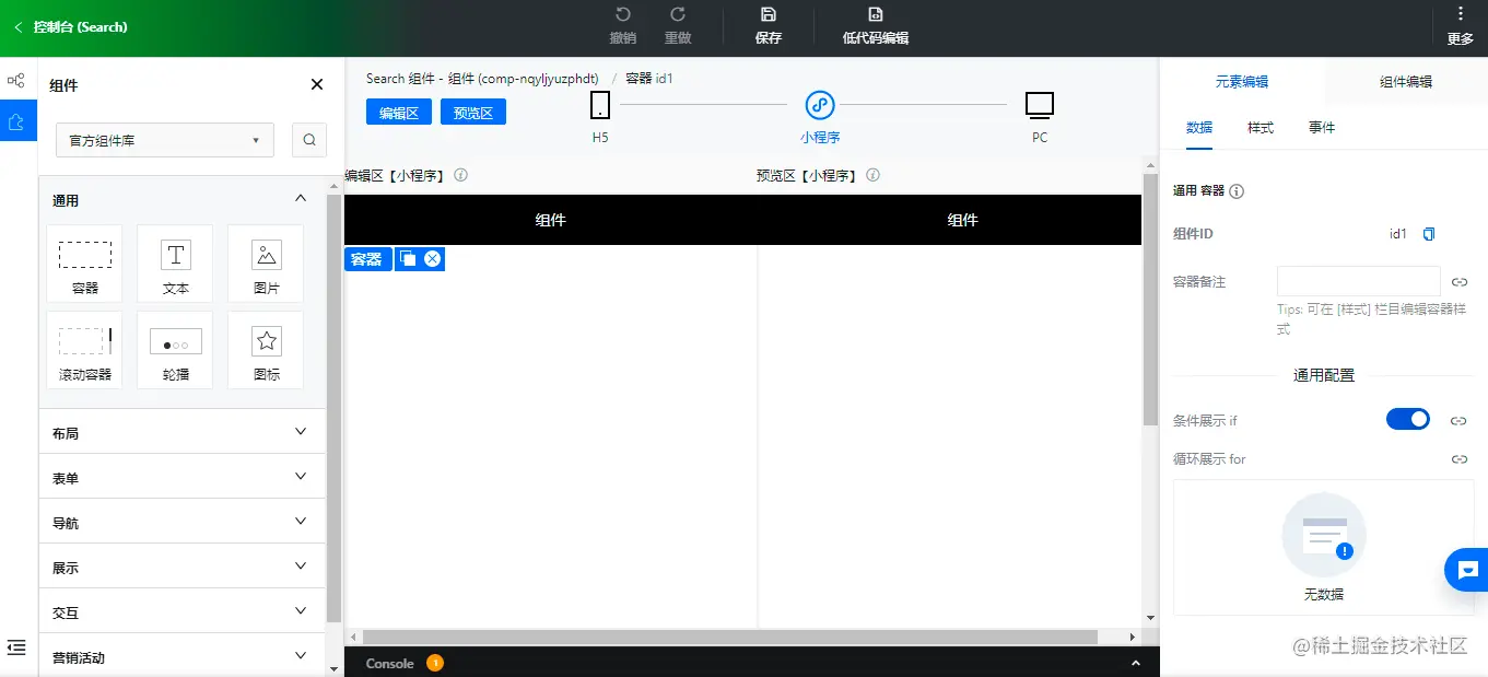 目标是实现一个常用的「搜索组件」,可以输入关键词,可以点击搜索按钮。其实低码组件和我们在应用里搭建的思路是一样的,也是先放置容器,然后放置文本输入组件和按钮组件,下边我们一步步的实现一下。