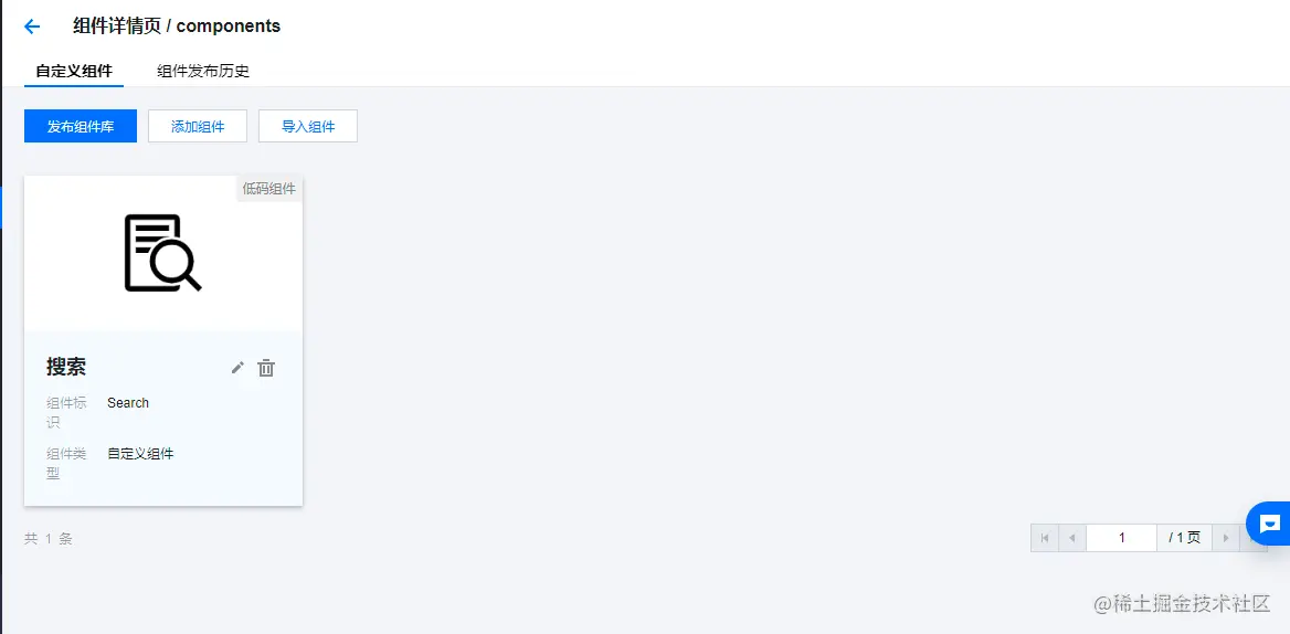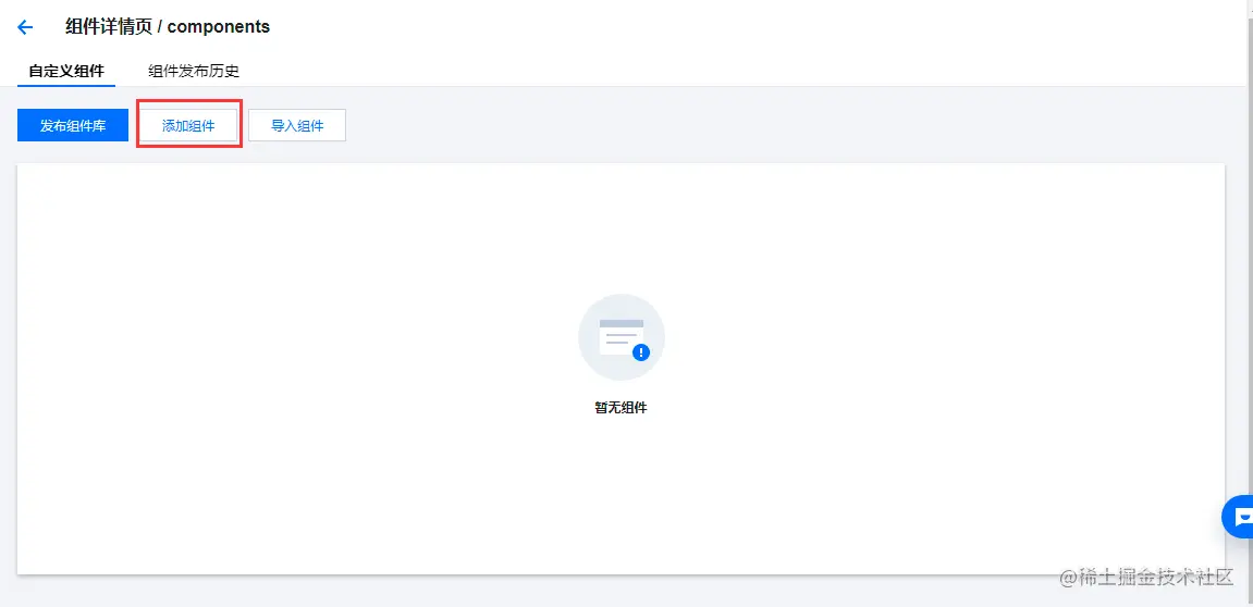 点击组件库的名称进入到自定义组件页面,点击【添加组件】按钮: