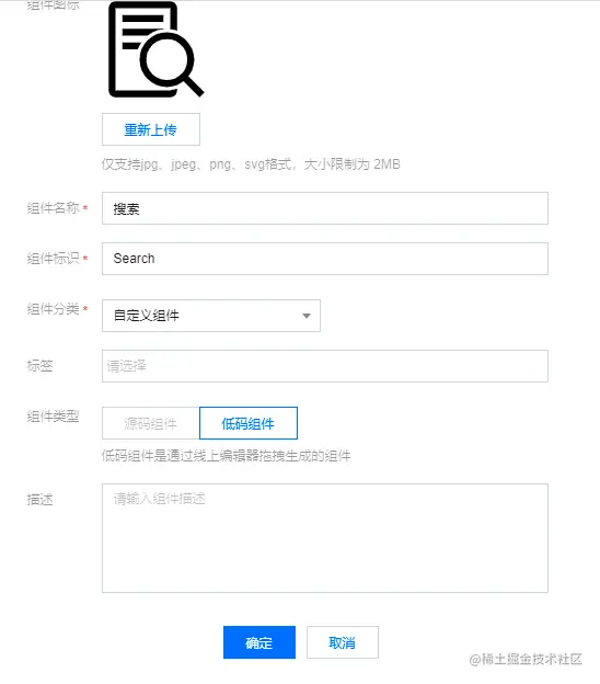我们需要定义组件的名称、标识、分类,上传组件的图标,点击【确定】按钮