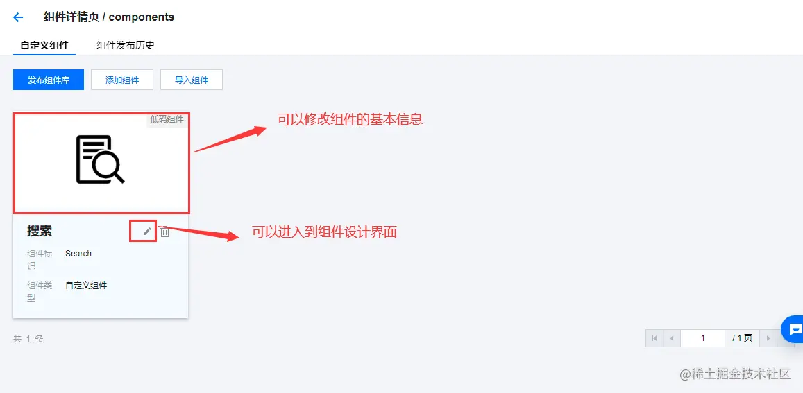 组件创建好后后续的操作需要说明一下,如果点击组件的图标可以修改刚才录入的信息,如果点击编辑按钮就进入到了设计界面: