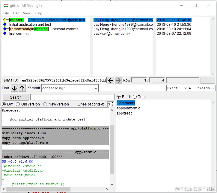 $ git log -pcommit ea3925e786f7975265fd43eface72f48af4306dd (HEAD -> master) Author: Jay Heng <hengjie1989@foxmail.com> Date: Sun Mar 11 07:46:16 2018 +0800 Add initial platform and update test diff --git a/app/platform.c b/app/platform.c new file mode 100644 index 0000000..e69de29 diff --git a/app/test.c b/app/test.c index e69de29..70dde01 100644 --- a/app/test.c +++ b/app/test.c @@ -0,0 +1,6 @@ +#include <stdio.h> +#include <stdlib.h> +void test(void) +{ + printf("this is test\n"); +} \ No newline at end of file // 此处略去其他commit信息 ...