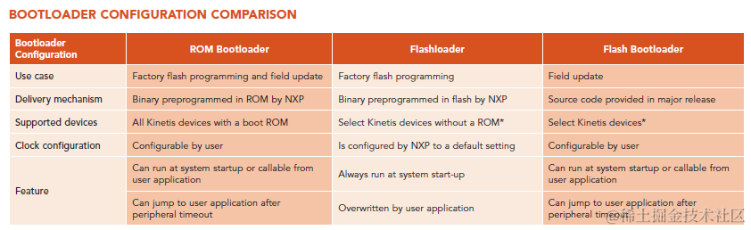 下表是KBOOT三种形态的对比,分别从use case、delivery mechanism、supported device、clock configuration、feature五大角度进行了对比:
