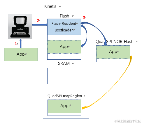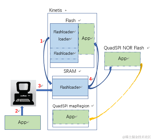 KBOOT的Flashloader形态其实也是放在内部Flash起始空间的,不过与Flash-Resident Bootloader形态在Flash里执行不同之处在于Flashloader形态是在SRAM里执行的,众所周知,SRAM断电是不保存数据的,因此Flashloader需要一个放在内部Flash里的配套loader程序,在芯片上电时先运行Flash里的loader程序,由loader程序将Flashloader从Flash中搬运到SRAM中并跳转到SRAM中运行。