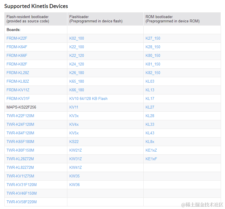 截止目前(2017年),KBOOT支持的Kinetis芯片全部列出在下表: