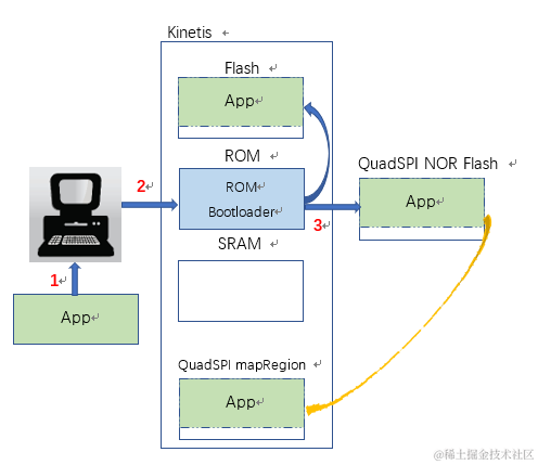 如果是从ROM启动,那么我们可以借助ROM将Application烧写进Flash(内部/外部)的起始空间并跳转过去执行。跳转至Flash执行分为:从内部Flash执行、从外部QSPI NOR Flash执行,这种执行选择是由ROM代码决定的。