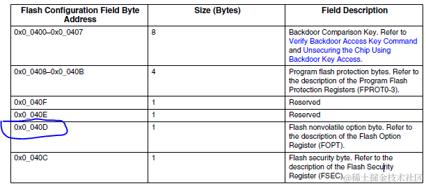 既然这些寄存器是readonly属性并且初值又是undefined的,那么其初值到底取决于什么?这里就涉及到Kinetis芯片中比较特别的FCF加载机制,FCF即Flash Configuration Field,其区域地址为Flash偏移0x400 - 0x40f,一共16个bytes,这16bytes内容组织如下: