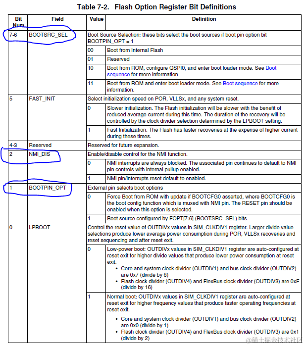 任何一次热启动后,芯片系统会自动从FCF区域加载初值进FTFx相应寄存器中,我们主要关注的是跟启动配置相关的FTFx_FOPT寄存器(特别注意,当FCF中对应FOPT的值是无效值0x00时,在加载过程中芯片自动会给FOPT赋值0xFF),下面是FTFx_FOPT寄存器的bit定义,其中BOOTSRC_SEL和BOOTPIN_OPT位是关键(注意这两个位在不含ROM空间的芯片上是reserved的)。