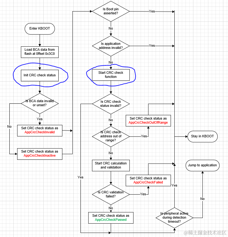 如果你使能了Integrity Check功能并把含有效Integrity Check配置的Application数据下载进了Flash,下一次芯片复位启动时会进入KBOOT执行,KBOOT会按照下面流程对Application进行完整性检测: