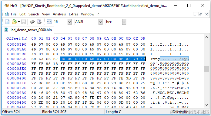 你可以用二进制编辑器打开你的Application binary文件查看Integrity Check数据是否添加成功,下面是痞子衡生成的新Application文件,可以看到crcStartAddress = 0, crcByteCount = 0x7A8, crcExpectedValue = 0x4779A38E。