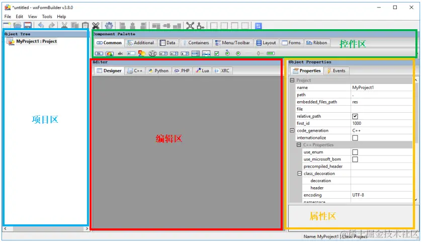 安装好wxFormBuilder软件之后打开这个软件,可见到如下界面,界面主要分为四大区:项目区、控件区、编辑区、属性区。软件使用起来非常简单,就是在【控件区】里点击添加需要的控件,这些控件的效果会在【编辑区】里实时显示,并在【属性区】这些控件的属性,【项目区】用于显示控件间的层级关系。
