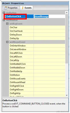有些控件是需要有响应的,比如Button,在GUI软件实际使用中,用户如果按下了Button,应该需要触发某个任务,任务需要有响应函数,这个响应函数需要在【Events】里设置,Button的响应函数在OnButtonClick里设置,痞子衡在这里指定了响应函数名为showMessage。在wxFormBuilder里我们只需要指定控件响应函数名即可,响应函数的具体功能实现,不属于wxFormBuilder设计范畴。