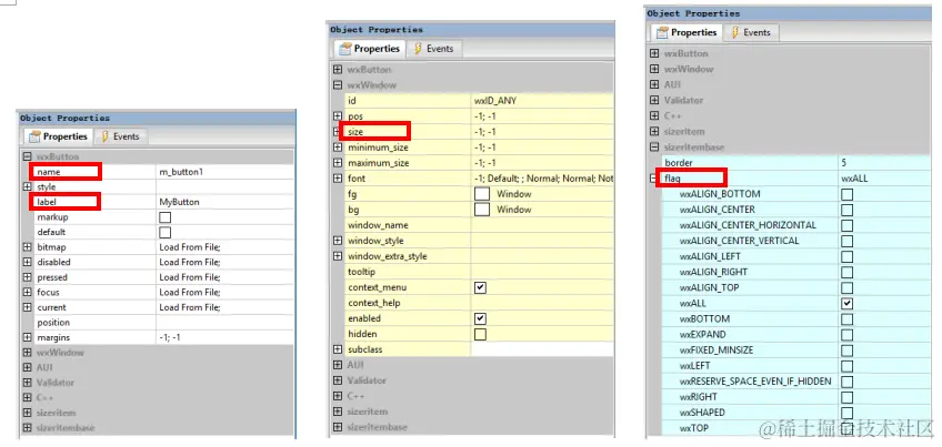 添加了所有控件之后,下一步便是分别设置控件的属性,进一步调整控件。痞子衡以Button属性为例,痞子衡勾选了如下4项比较重要的属性设置,分别是name(button在后续python代码的对象名,一般需要按其功能修改,修改后使得代码阅读/修改起来更直观)、label(button在GUI里显示的标签名,此处是MyButton,也需要按其功能修改,方便用户使用软件)、size(设置button的尺寸,这个尺寸最大不应超过Sizer尺寸)、flag(调整对齐方式从而调整Button在Sizer里的位置)。另外有一个属性不得不说,即控件位置pos,在wxFormBuilder里设置这个属性并不生效,痞子衡猜想可能跟Sizer样式有关,因为Sizer决定了控件间相对位置关系,因此控件的pos不能随意设置。