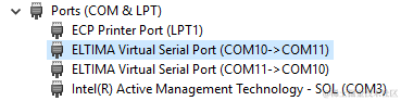 很多时候手头并没有物理串口设备,那么这时候我们就需要借助虚拟串口软件,vspd就是一款虚拟串口驱动,其官方主页为 www.eltima.com/products/vs…,使用vspd可以在PC上虚拟出串口设备并实现虚拟连接,由于vspd不支持单设备回环连接,那么我们需要虚拟出两个串口设备并实现连接,痞子衡使用vspd虚拟出了COM10和COM11,并将其进行了连接: