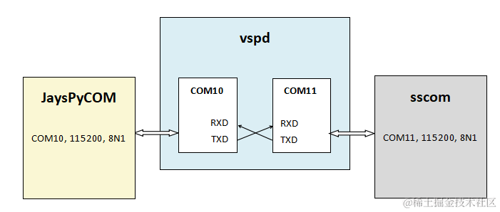 痞子衡选用的是vspd虚拟串口来测试,最终搭建的黑盒测试环境示意图如下: