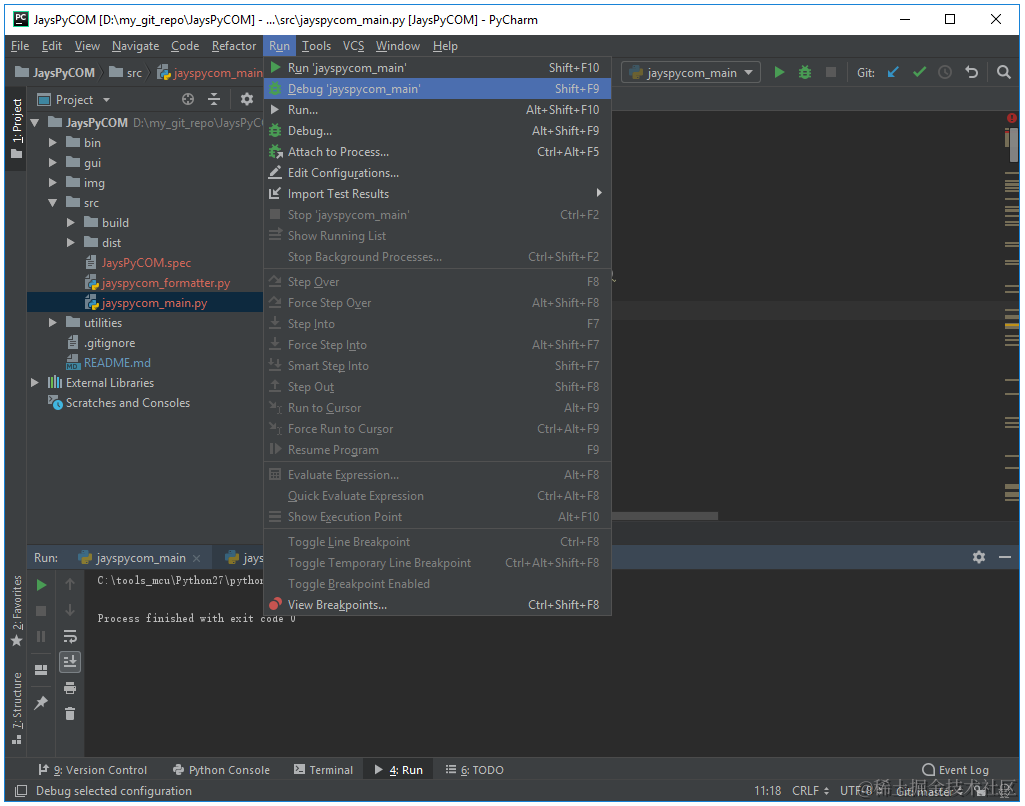 如果在黑盒测试过程中发现pzh-py-com功能有问题,从代码逻辑角度也不能立刻推断出问题,此时便需要使用Python IDE进行在线debug,痞子衡选用的PyCharm软件,创建pzh-py-com工程后将其放于pzh-py-com主目录,工程会自动添加目录下所有源文件,选中main.py文件后选择Debug(Shift+F9)便可以进行单步调试。