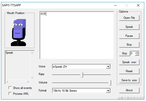 如果想直接体验eSpeak的发音质量,可以直接打开\eSpeak\TTSApp.exe应用程序,软件使用非常简单: