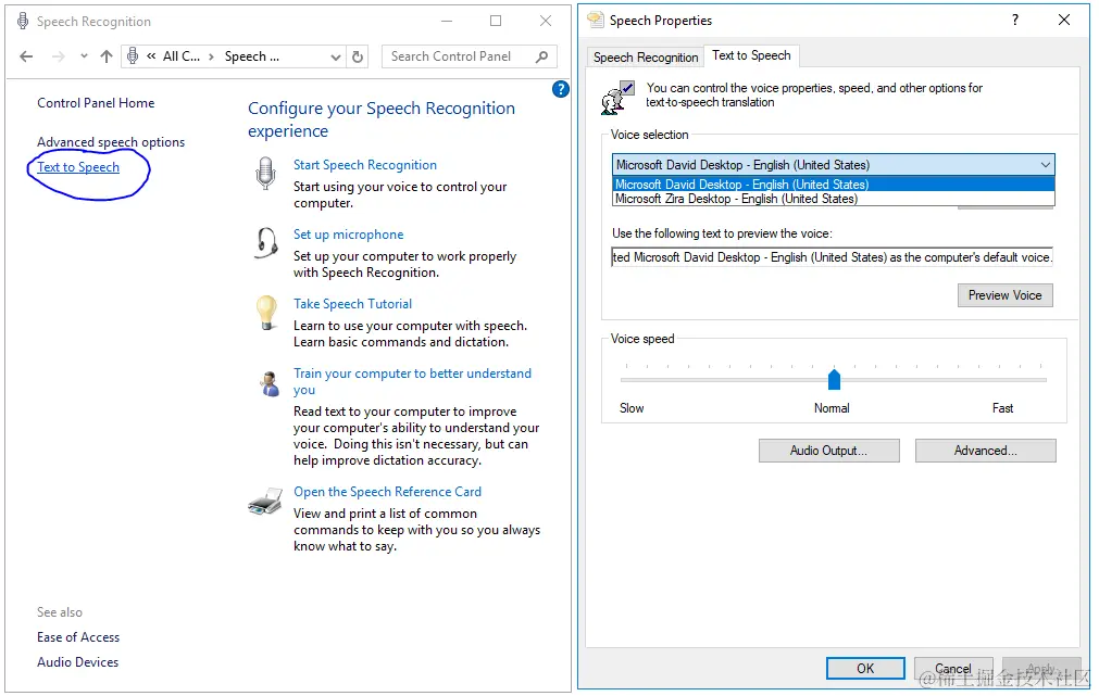 在使用pyttsx3进行文语合成时,依赖的是当前PC的语音环境,打开控制面板(Control Panel)->语言识别(Speech Recognition),可见到如下页面: