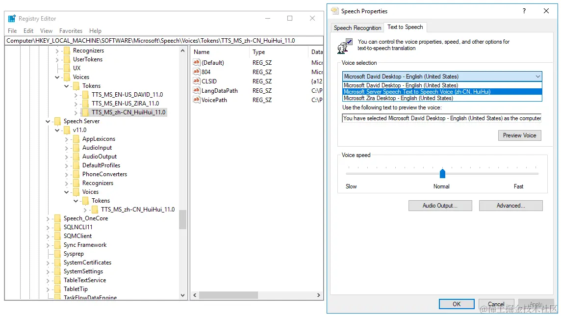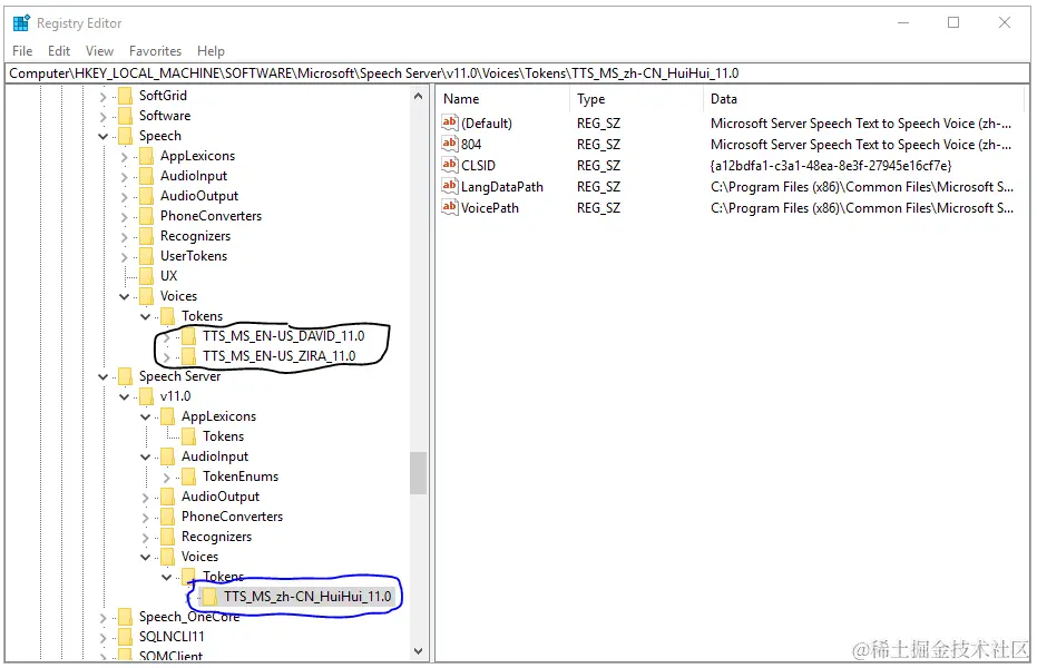 Note: 上述修改仅针对32bit操作系统,如果是64bit系统,需要同时将HKEY_LOCAL_MACHINE\SOFTWARE\WOW6432Node\Microsoft\Speech Server\v11.0\Voices路径的注册表按同样方法也操作一遍。