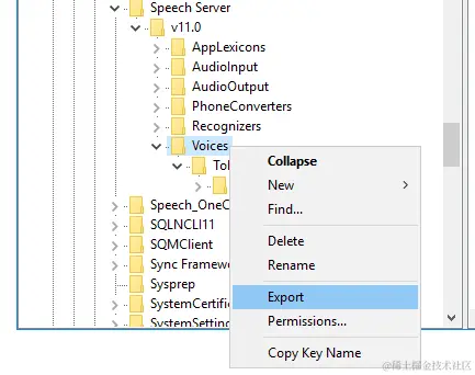 右键HKEY_LOCAL_MACHINE\SOFTWARE\Microsoft\Speech Server\v11.0\Voices,将其导出成.reg文件,使用文本编辑器打开这个.reg文件将其中"\Speech Server\v11.0"全部替换成"\Speech"并保存,然后将这个修改后的.reg文件再导入注册表。