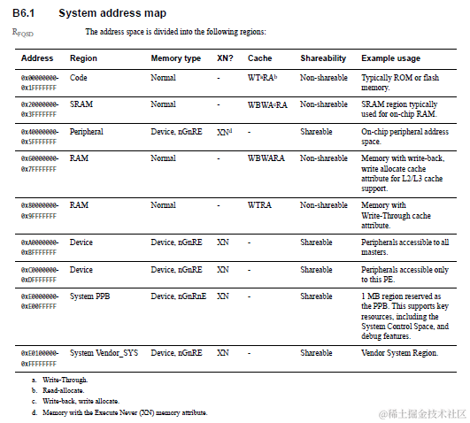 大家都知道,ARM Cortex-M内存使用的是统一编址,32bit总线的地址空间是4GB (0x00000000 - 0xFFFFFFFF)。打开最新的Arm®v6/7/8-M Architecture Reference Manual手册找到如下system address map表,你会发现ARM已经将这4GB空间内容给初步规划好了,各ARM Cortex-M微控制器厂商在设计芯片时一般都会遵守ARM规定。