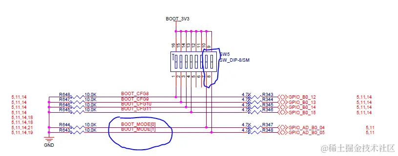 i.MXRT1xxx上电永远是从ROM启动去执行BootROM程序,最顶层的Boot行为模式由BOOT_MODE[1:0] pins的状态决定,想进入Serial Downloader模式最直接的方式便是将BOOT_MODE[1:0]输入状态拨成2'b01,在设计i.MXRT1xxx的硬件板时BOOT_MODE[1:0] pins应设计成可通过拨码开关选择输入电平,下图是RT1052硬件板的参考设计: