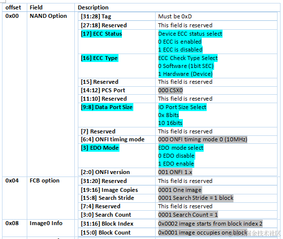 从上表我们可以知道,其实这12byte数据提供的配置信息还是比较多的,涵盖NAND配置、FCB配置、Image配置,但是与FCB/DBBT原本的数据结构相比已经大幅精简,我们还可以再进一步简化,这12byte里真正需要注意的只有四个地方(ECC status、ECC Type、IO Port Size、EDO mode),其余可用固定配置。由于此处我们示例NAND芯片为MX30LF4GE8AB-TI,查看NAND芯片手册可知其是x8 IO且没有HW ECC,那么IO Port Size需设2'b01(即x8),ECC type、ECC status分别可设1'b1、1'b0(HW ECC Check,initial HW ECC is enabled,其实这样设在没有HW ECC的NAND芯片上的意思是不使能ECC Check),EDO mode可设1'b0(即non-EDO模式)。