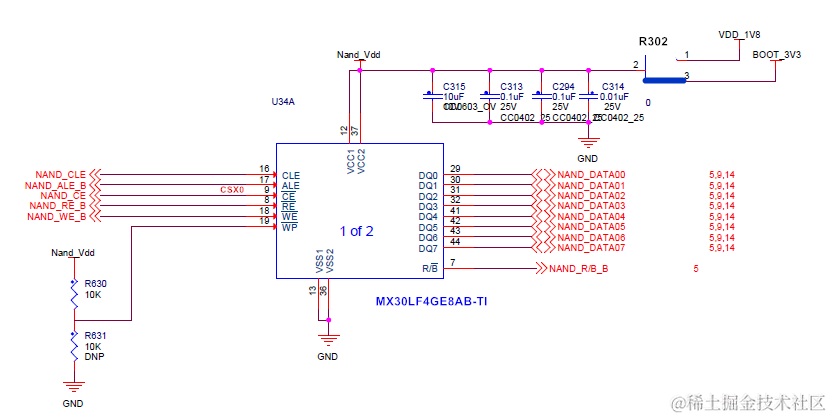 如下是典型的NAND硬件连接设计,示例NAND芯片是MX30LF4GE8AB-TI(经典的TSOP-48封装,芯片丝印上的L表明其是3.3V供电),其中WP#信号没有使能,并且供电选择同时支持3.3V和1.8V(通过R302选择,此处应连2-3),有朋友会疑问,为什么此处要留有2路不同供电电压?因为后期方便我们更换不同的供电输入的NAND芯片。