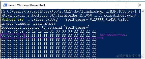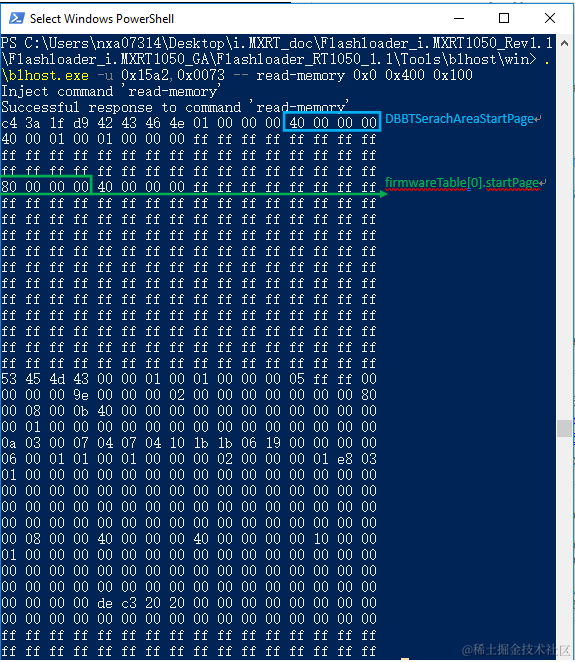 Bootable image下载成功之后,同样我们可以试着用read-memory从NAND芯片里读回IVT,BootData,Application确认一下,Bootable image起始地址在0x40000,那么IVT,BootData应该在0x40400,Application应该在0x42000,查看数据发现确实是有效的Bootable image。你可能会疑问,NAND的读写操作一般都是按page的,为何我们使用read-memory命令提供的地址参数可以不按page对齐?其实Flashloader内部会有page缓存区,Flashloader底层对NAND的访问是按page进行的,并缓存在内部page缓存区,接口上层来读写NAND数据实际是在page缓存区进行的,所以不受page对齐限制。