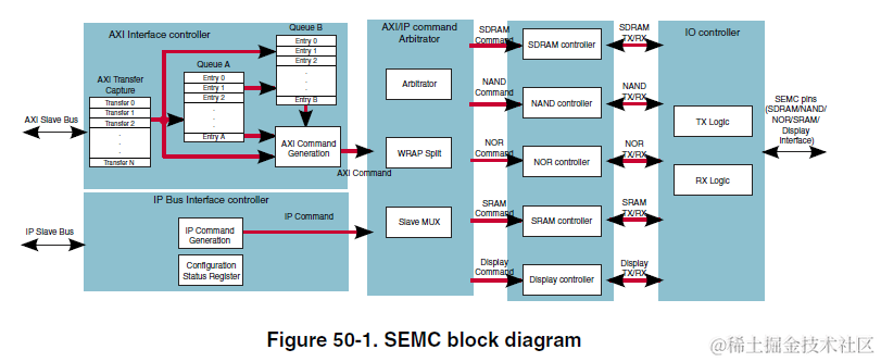 i.MXRT对于Raw NAND的底层接口支持是通过内部SEMC这个IP实现的,如下是SEMC的内部模块图,从图中我们可以看到,从内部数据总线来看SEMC支持AXI Bus/IP Bus两种(此两种方式会在后续eFUSE配置里看到),而从外部接口来看SEMC最多能支持五种设备(SDRAM, NAND, NOR, SRAM, 8080 Display),NAND是其中一种。