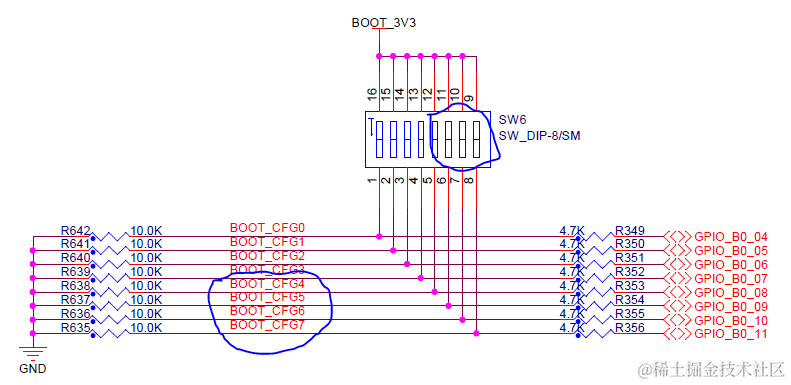 设置好正确Boot模式后,再来选择Boot Device,Boot Device由BOOT_CFG1[7:4]这四个pin的输入状态决定,下图是RT105x/RT106x硬件板的参考设计,拨码开关SW6应拨向SW_DIP-8的7,8,11,即设置BOOT_CFG[7:4]=4'b001x(4'b001x适用于i.MXRT105x/i.MXRT106x,对于i.MXRT102x此值应为4'b01xx),此时便进入了从SEMC NAND启动模式。