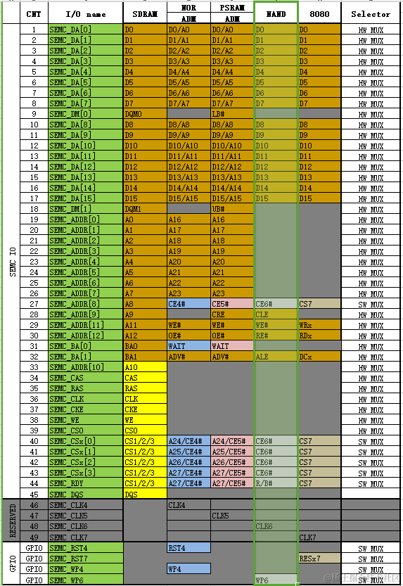 虽然SEMC最多能支持五种设备,但并不是同时支持的,同一时刻仅能支持一种设备,因此SEMC接口信号必然是复用的,下表是SEMC接口复用表,关于NAND接口信号,需要特别说一下的是CE#信号,从表中我们可以看到NAND的CE6#信号有5个,即有5种配置选择,但i.MXRT BootROM固定选择的是SEMC_CSX[0],这点在设计NAND硬件连接时需要特别注意。