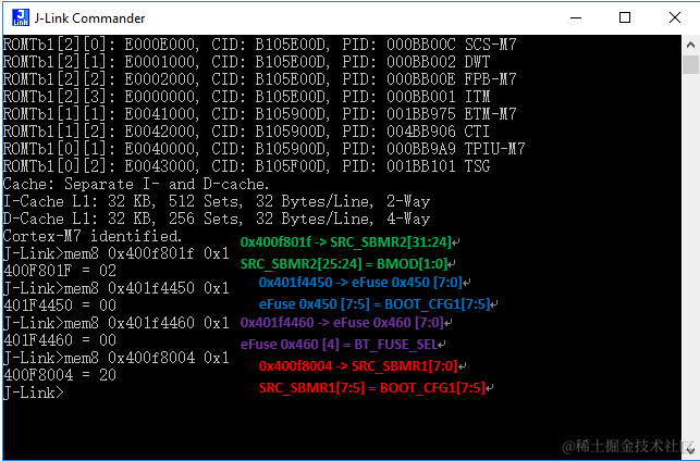 如果想确保i.MXRT芯片一定正在从Raw NAND启动,可在芯片上电时使用Jlink调试器或者借助Flashloader读取芯片内部2个寄存器的值,这2个寄存器分别是SRC_SBMR1/2, 我们设的关于启动模式的BOOT_MODE pins/BOOT_CFG pin/eFUSE偏移0x450配置值在上电时会自动加载到SRC_SBMR1/2寄存器里,BootROM主要是根据SRC_SBMR1/2寄存器的值来判断启动模式的。