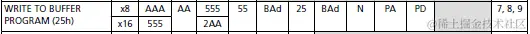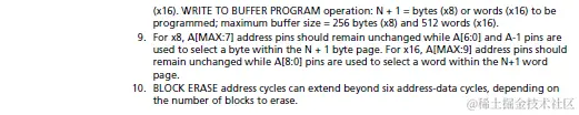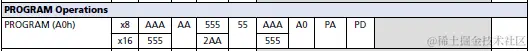 CFI手册里也没有明确规定Parallel NOR接口命令,同样地业界还是有默认的标准,如下是从Micron MT28EW系列手册里截取的部分基本命令,包括Reset、Read、Read CFI、Program(Word program)、Buffer Program、Block(Sector) Erase,涵盖读写擦最基本的三种操作,这些基本命令在主流厂商的NOR产品里都被支持。此外,NOR还支持更多高级命令(Blank Check、security/protect相关,lower power相关等),那些命令因Device而异,不是本文讨论重点。