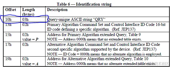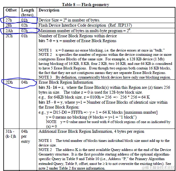 此外,还有一个必有命令不得不提,这个命令是Read CFI,用于获取芯片内部存储的出厂信息(包括内存结构、特性、其他行为参数等),这个query table最多由五部分组成,其结构已由CFI规定如下表,痞子衡已经圈出了一些重要信息,在设计NOR软件驱动时,可以通过获取这个query table来做到代码通用。