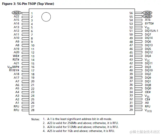 NOR芯片根据Flash size大小不同封装也不尽相同,以经典的128Mb容量的ADP NOR芯片为例,其封装一般有三种TSOP-56, TFBGA-56, LFBGA-64,下图是TSOP-56封装信号分布: