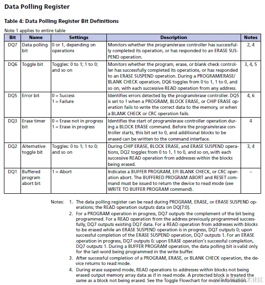 除了读写擦这三个最基本命令外,还有一个Data Polling机制也非常常用,这个机制用于获取命令(主要是Program/Erase)执行状态与结果,当Program/Erase命令发给NOR device之后,NOR device是通过DQ[7:0]引脚来返回命令执行状态的,各bit意义如下图所示,简单来说DQ3(Erase timer bit)表明操作的开始,DQ5(Error bit)表明操作过程中是否发生硬件错误,DQ6(Toggle bit)表明操作是否结束。