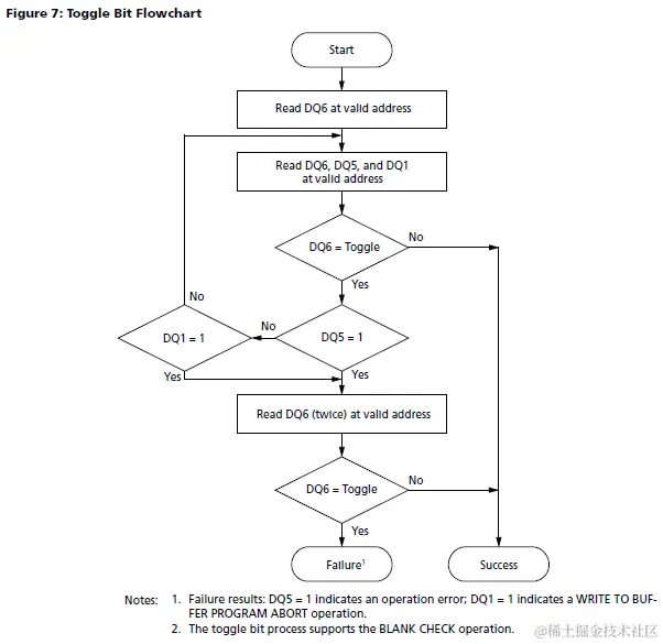 下图为Toggle bit检测的流程图,这个检测流程是最常用的,主要用于确认Program/Erase操作是否成功地执行了。