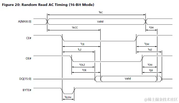 数据存取速率是个重要的技术指标,对于这个指标,CFI手册里并没有定义,所以需要根据NOR Flash手册里的AC characteristics表来确定。以异步模式Read命令为例讲解(以Micron生产的型号为MT28EW128ABA为例),下面是Read的两种模式Random Read和Page Read完整时序简图: