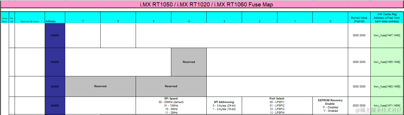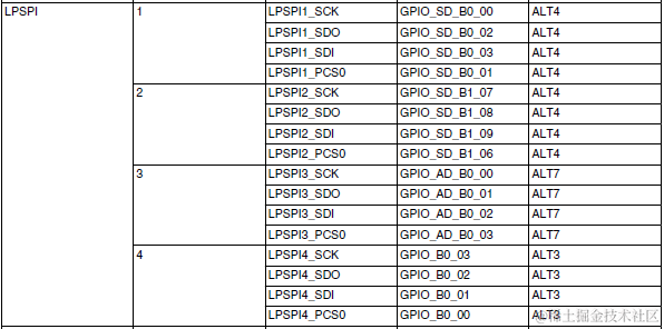 i.MXRT1xxx对于Serial EEPROM/NOR的底层接口支持是通过内部LPSPI这个IP实现的,i.MXRT1xxx内部一共有4个LPSPI,BootROM对这4组LPSPI都支持,具体pinmux如下(适用RT1050):