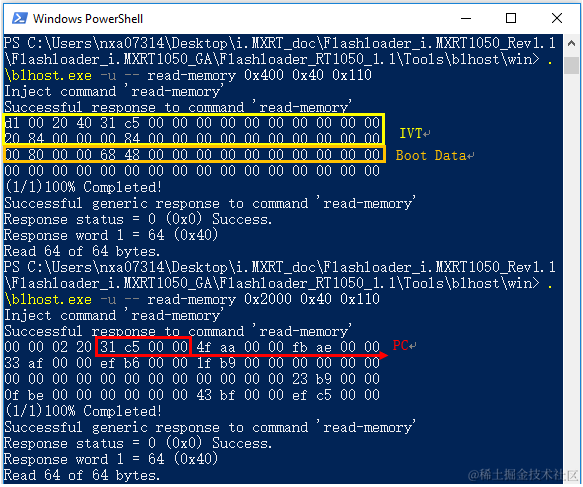 Bootable image下载成功之后,我们可以试着用read-memory从Serial EEPROM/NOR芯片里读回IVT,BootData,Application确认一下,Bootable image起始地址在0x0,那么IVT,BootData应该在0x400,Application应该在0x2000: